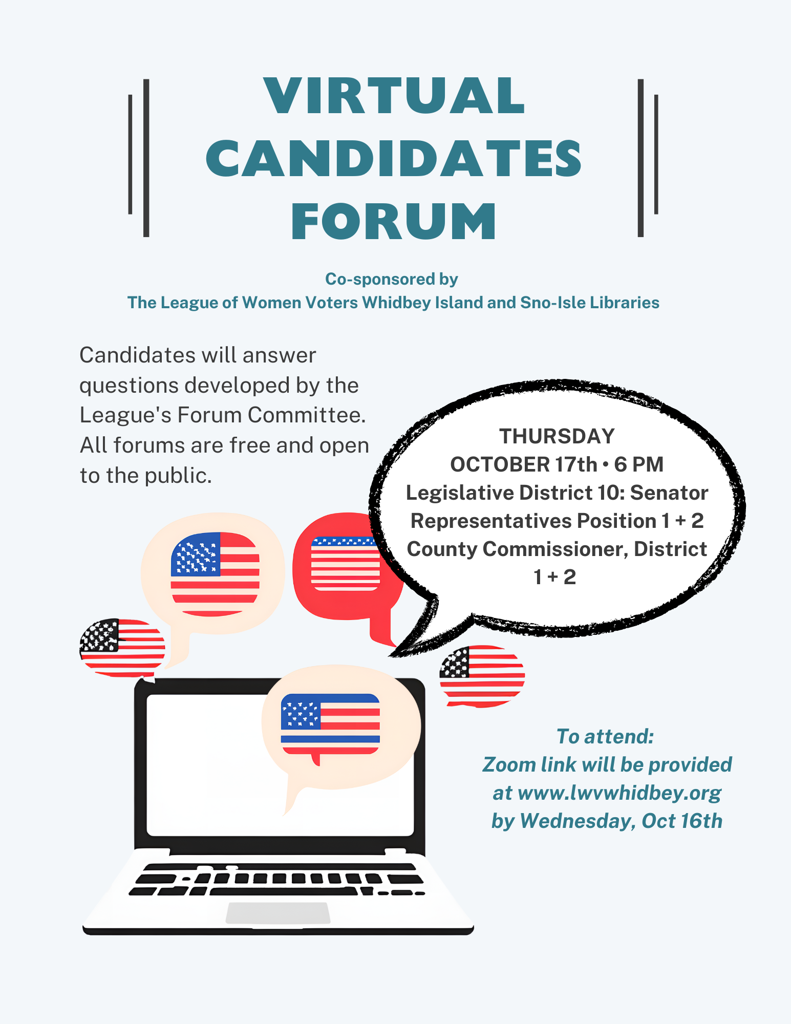 Candidates will answer questions developed by the League's Forum Committee. THURSDAY OCTOBER 17 6 PM Legislative District 10: Senator Representatives Position 1 + 2; County Commissioner, District 1 + 2