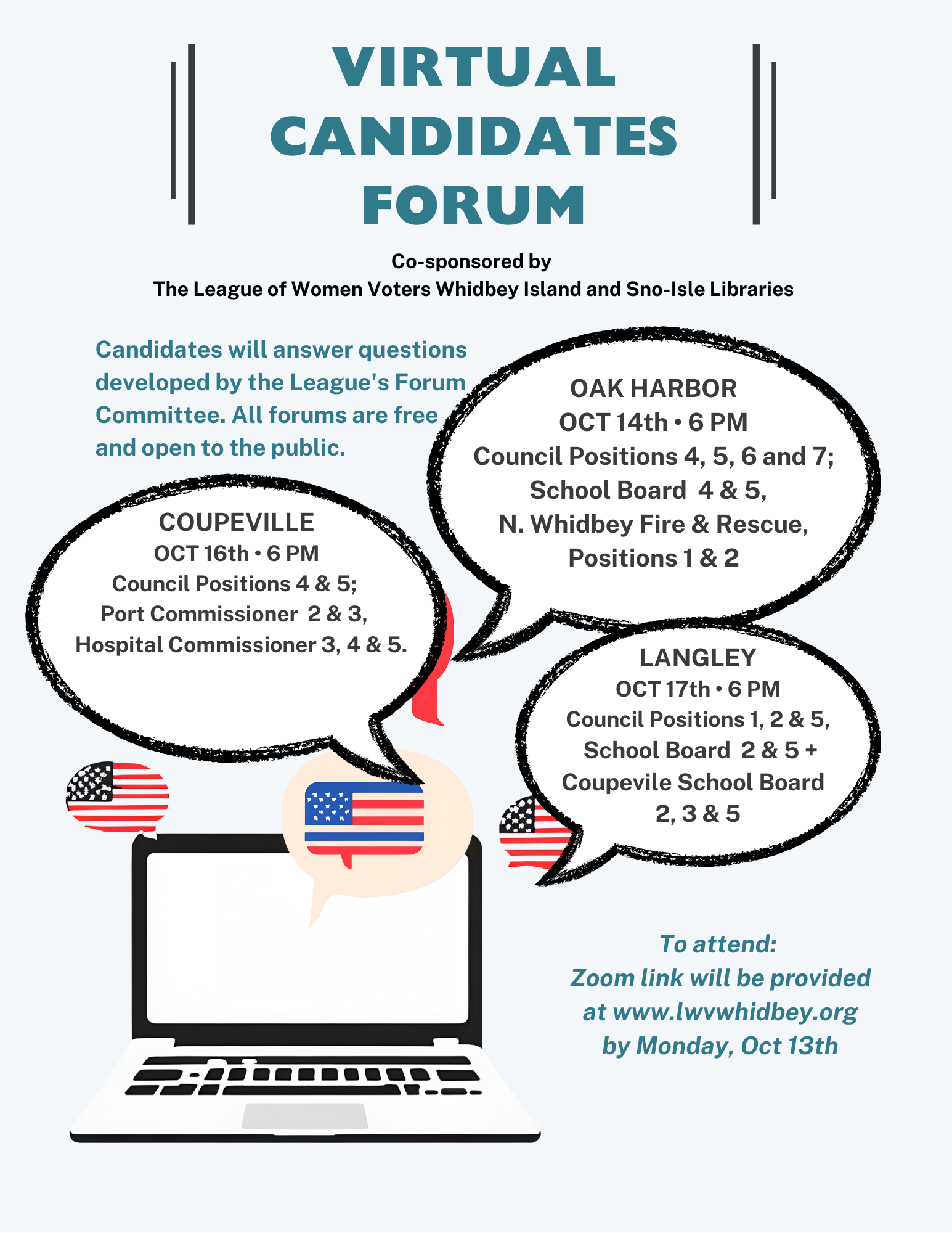 Langley/South Whidbey's will be on October 17, and cover Langley Councilmember Positions 1, 2 & 5, and School Board Director Positions 2 & 5. Also: Coupeville School Board Director Positions 2, 3 and 5.